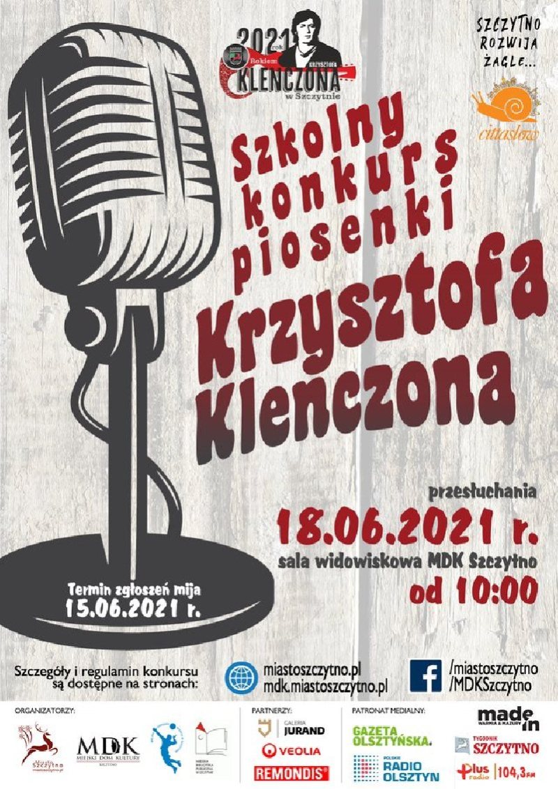 Serdecznie zapraszamy mieszkańców do wzięcia udziału w Szkolnym Konkursie Piosenki Krzysztofa Klenczona, który odbędzie się 18 czerwca 2021 r. w Miejskim Domu Kultury w Szczytnie.