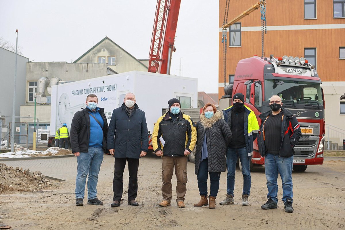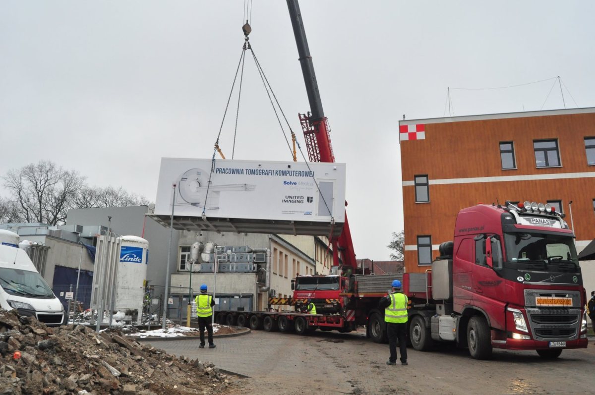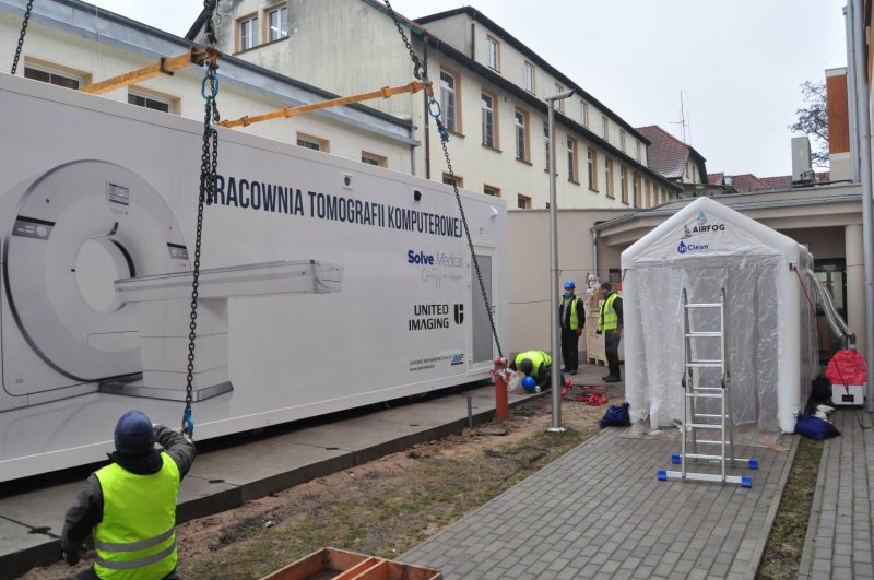 Tomograf, który trafił do Szczytna to jedno z najnowocześniejszych w tej chwili urządzeń. Szpital otrzymał go z Agencji Rezerw Materiałowych. Sprzęt ważący około 14 ton stanął w pobliżu wejścia do skrzydła covidowego. Aby je tam ustawić użyto potężnego dźwigu, który zdjął pracownię mobilną z tira i postawił we wskazane miejsce.