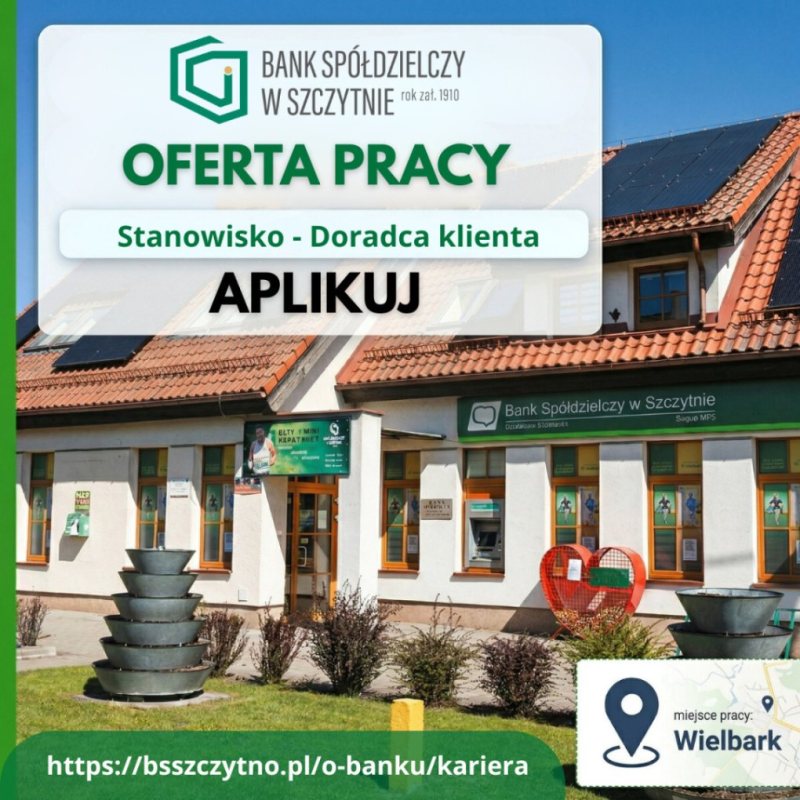Bank Spółdzielczy w Szczytnie prowadzi rekrutację. Poszukuje pracownika na stanowisko doradcy klienta. Miejsce pracy – Wielbark.