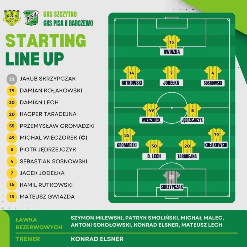 GKS Szczytno rozpoczął spotkanie w wyjściowym składzie, a na ławce rezerwowych znaleźli się m.in. Mateusz Lech, Szymon Milewski, Michał Malec, Patryk Smoliński, Konrad Elsner i Antek Sokołowski.