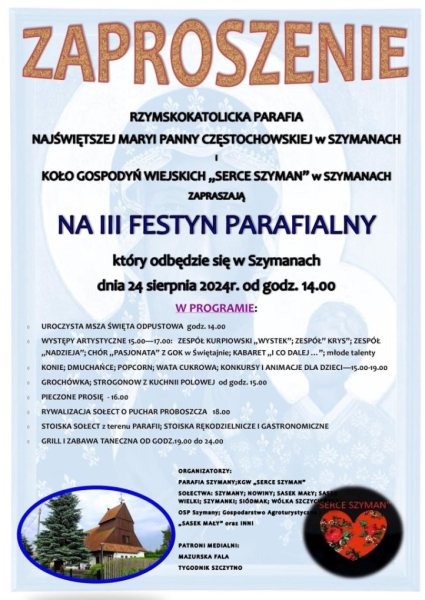 W najbliższą sobotę, 24 sierpnia, Szymany staną się centrum lokalnej rozrywki. W ramach III Festynu Parafialnego, organizowanego przez Rzymskokatolicką Parafię Najświętszej Maryi Panny Częstochowskiej oraz Koło Gospodyń Wiejskich "Serce Szyman", mieszkańcy i goście będą mogli cieszyć się bogatym programem pełnym atrakcji.