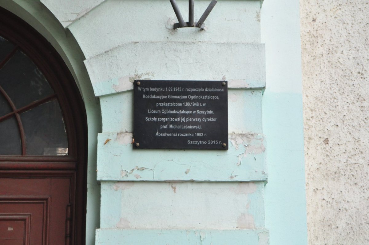 Tablica o treści „W tym budynku 1.09.1945 r. rozpoczęło działalność Koedukacyjne Gimnazjum Ogólnokształcące, przekształcone 1.09.1948 r. w Liceum Ogólnokształcące w Szczytnie. Szkołę zorganizował jej pierwszy dyrektor prof. Michał Leśniewski. Absolwenci rocznika 1952 r.” pojawiła się na budynku w 2015 roku. Miała prawo tam wisieć do 2050 roku.