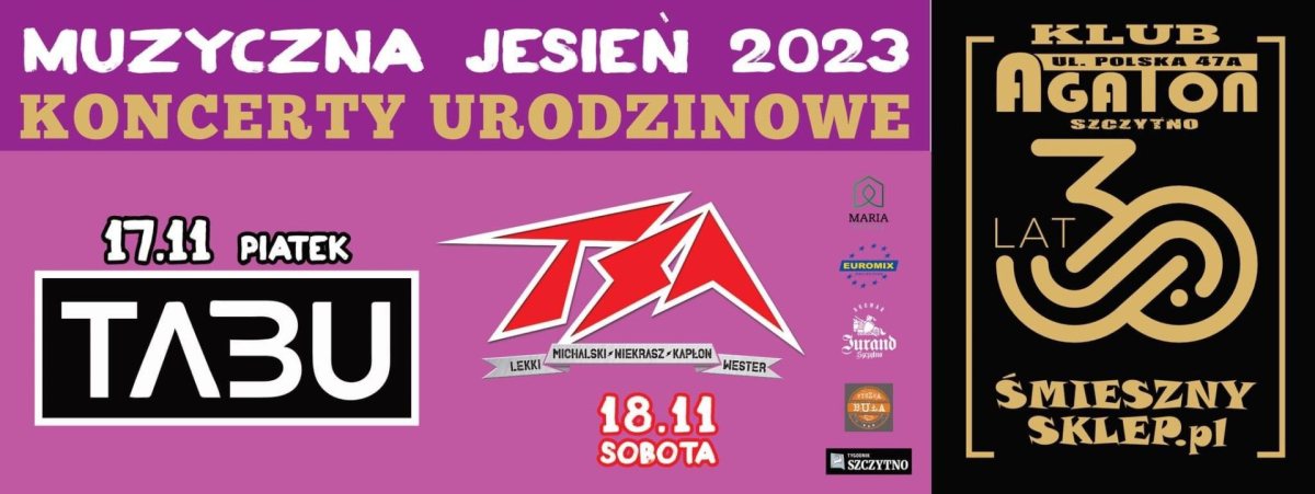 Przed nami najbardziej muzyczny weekend tego roku Szczytnie. W piątek, 17 listopada w klubie Agaton 2 zagra najbardziej znana grupa reggae Tabu, a w sobotę, 18 listopada na scenie Agatonu pojawi się klasyka polskiego metalu grupa TSA.