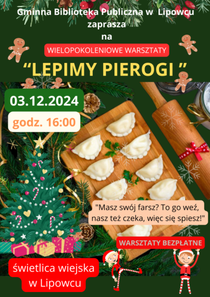 Gminna Biblioteka Publiczna w Lipowcu zaprasza wszystkich miłośników domowych smaków na wielopokoleniowe warsztaty kulinarne „Lepimy pierogi”. Spotkanie odbędzie się 3 grudnia roku o godzinie 16:00 w świetlicy wiejskiej w Lipowcu.