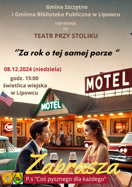Gmina Szczytno oraz Gminna Biblioteka Publiczna w Lipowcu zapraszają na wyjątkowe wydarzenie – Teatr przy Stoliku. 8 grudnia o godzinie 15:00 w świetlicy wiejskiej w Lipowcu odbędzie się przedstawienie „Za rok o tej samej porze”.
