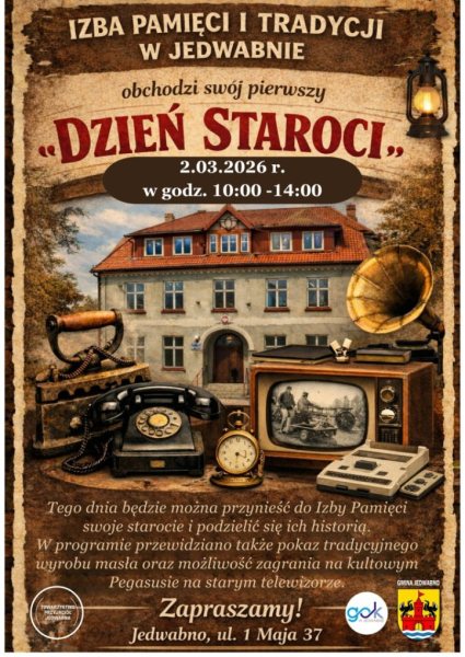 2 marca w godz. 10.00–14.00 Izba Pamięci i Tradycji w Jedwabnie zaprasza na pierwszy „Dzień Staroci”. Henryka Budna i Włodzimierz Budny otworzą drzwi do trzech sal w dawnym budynku urzędu gminy przy ul. 1 Maja 37. Będzie można przynieść własne przedmioty sprzed lat, opowiedzieć ich historię, zobaczyć pokaz wyrobu masła i zagrać na kultowym Pegasusie podłączonym do starego telewizora.