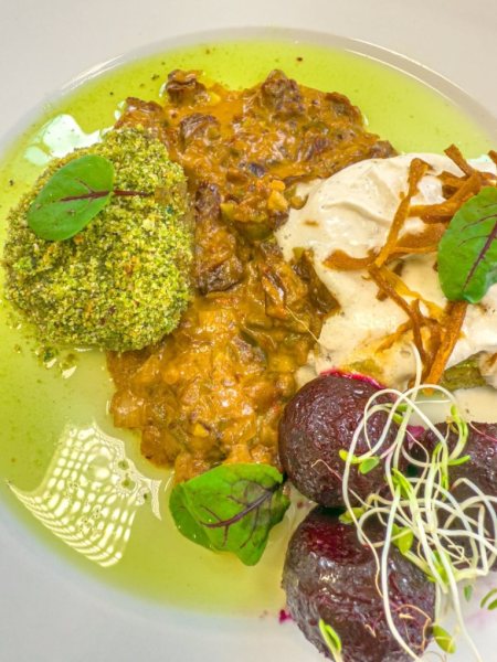 Obok niej znalazły się krokiety z porki mazurskiej, a całość dopełniał mus z koziego sera w maśle z miodem, flambirowany żubrówką i posypany olejem szczypiorkowym.