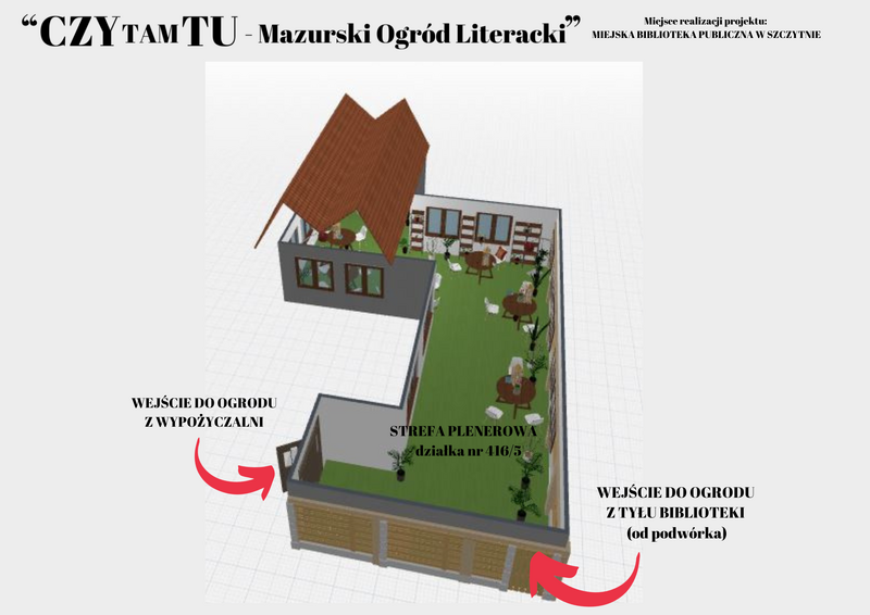 Teren znajdujący się na tyłach biblioteki (działka nr 416/5) zostanie przeobrażony w „CZYTAMTU – Mazurski Ogród Literacki” bogaty w różnorodną roślinność. Połowa wskazanej działki zostanie również zadaszona. Wejście na zmodernizowany plener, gdzie zostanie zamontowane podłoże tarasowe, zostanie ogrodzone dwoma bramami: wjazdową oraz furtką. Całość obiektu ozdobią rośliny, meble ogrodowe zewnętrzne, oświetlenie, banner z podświetlanym logo. Teren zostanie objęty profesjonalnym monitoringiem.