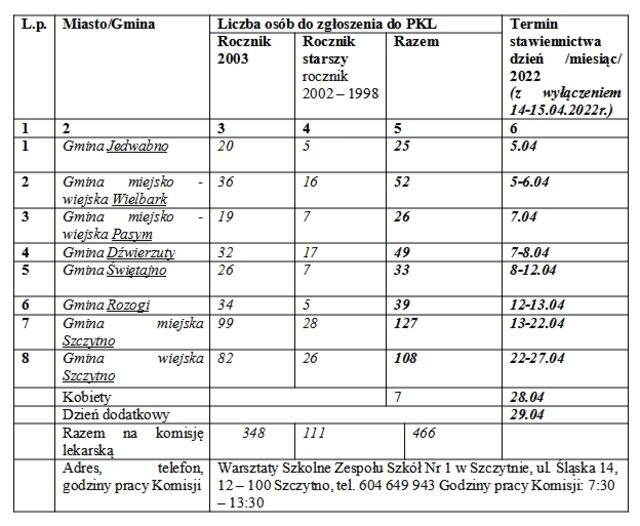 Ruszyła kwalifikacja wojskowa. Tak jak w latach ubiegłych prowadzona jest w Warsztatach Szkolnych Zespołu Szkół Nr 1 w Szczytnie. Przed komisjami lekarskimi muszą się stawić głównie młodzi mężczyźni, którzy urodzili się w 2003 roku.