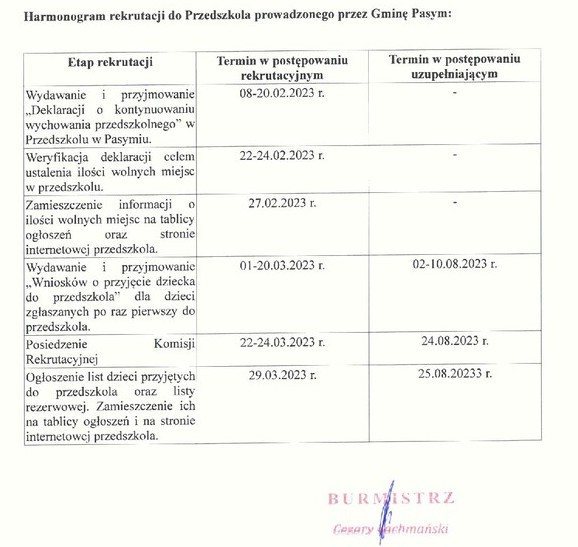Trwa rekrutacja do przedszkoli prowadzonych przez Gminę Pasym na rok 2023/2024. Poniżej prezentujemy harmonogram rekrutacji.