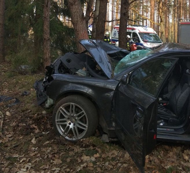 W okolicy Baranowa (gmina Wielbark) roztrzaskało się audi a4. Auto potężnie uderzyło w drzewo. W wypadku poważnie ucierpiały trzy młode osoby. Dwie z nich helikopterem przetransportowano do szpitala.