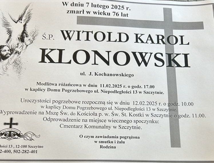 W wieku 76 lat zmarł Witold Klonowski, ceniony i lubiany mieszkaniec Szczytna. Rodzina i bliscy pożegnają go podczas uroczystości pogrzebowych, które odbędą się w środę, 12 lutego.