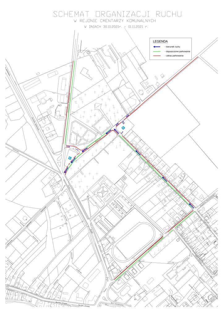W związku z tym, że w ostatnich latach obserwuje się wzmożony ruch w rejonie cmentarzy już w weekend poprzedzający lub następujący po dniu „Wszystkich Świętych”, czasowa organizacja ruchu objęta niniejszym projektem obowiązywać będzie od dnia 30.10.21r. godz. 07:00 (sobota), do dnia 02.11.2021r. godz. 07:00 (wtorek).