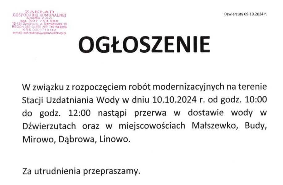 Zakład Gospodarki Komunalnej w Dźwierzutach, odpowiedzialny za realizację prac, przeprasza za utrudnienia i zapewnia, że modernizacja przyczyni się do poprawy jakości dostarczanej wody oraz zwiększenia efektywności działania stacji uzdatniania.