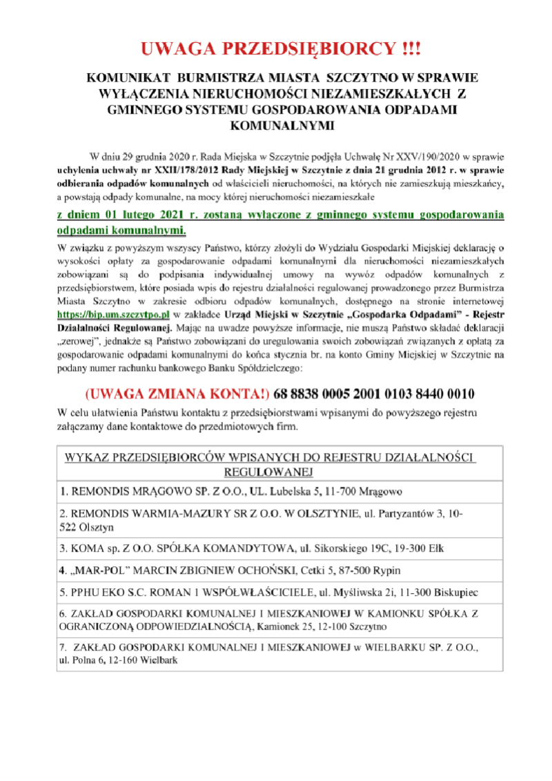 Uwaga Przedsiębiorcy! Komunikat Burmistrza Miasta Szczytno. Szczegóły na plakacie.