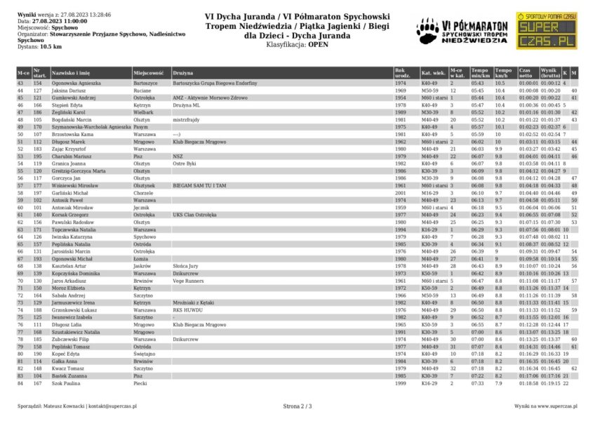 17 - 63 Bogusz Piotr Warszawa RKS HUWDU 1977 M40-49 8 05:14 11.5 51:03 01:49:38 01:49:44 15