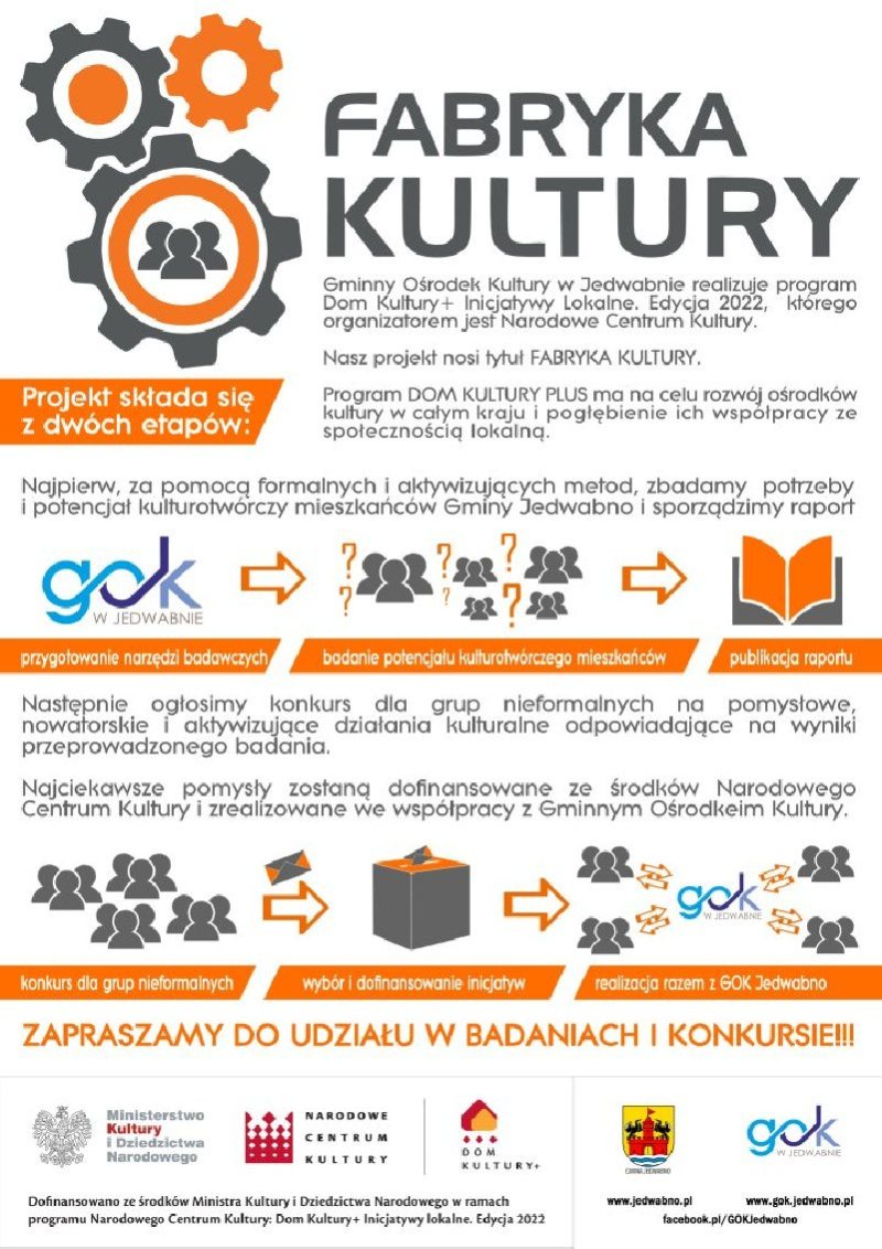 Nasz projekt nosi tytuł FABRYKA KULTURY – informuje dyrektor Adam Cudak. - Najpierw, za pomocą formalnych i aktywizujących metod, zdiagnozujemy potrzeby i potencjał kulturotwórczy mieszkańców gminy Jedwabno. Na tej podstawie powstanie raport z diagnozy dostępny dla wszystkich. Następnie ogłosimy konkurs dla grup nieformalnych na pomysłowe, nowatorskie i aktywizujące działania kulturalne odpowiadające na wyniki badania. Do kolejnego etapu wybierzemy od 3 do 7 zgłoszonych inicjatyw. Na ten etap otrzymaliśmy dofinansowanie w kwocie 10 000 zł. W drugim etapie autorzy najciekawszych zadań wspólnie z GOK Jedwabno zrealizują zgłoszone inicjatywy. Na ten cel możemy przeznaczyć do 30 000 zł. Zapraszamy do udziału w badaniach i konkursie.