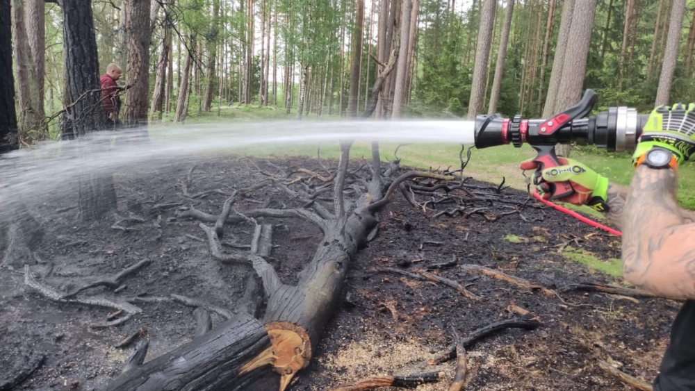 Druhowie przenieśli sprzęt i rozpoczęli działania gaśnicze. Ogień sprawnie ugaszono. Na miejsce dotarł też ciągnik rolniczy z nadleśnictwa Jedwabno, który oborał zagrożony teren.