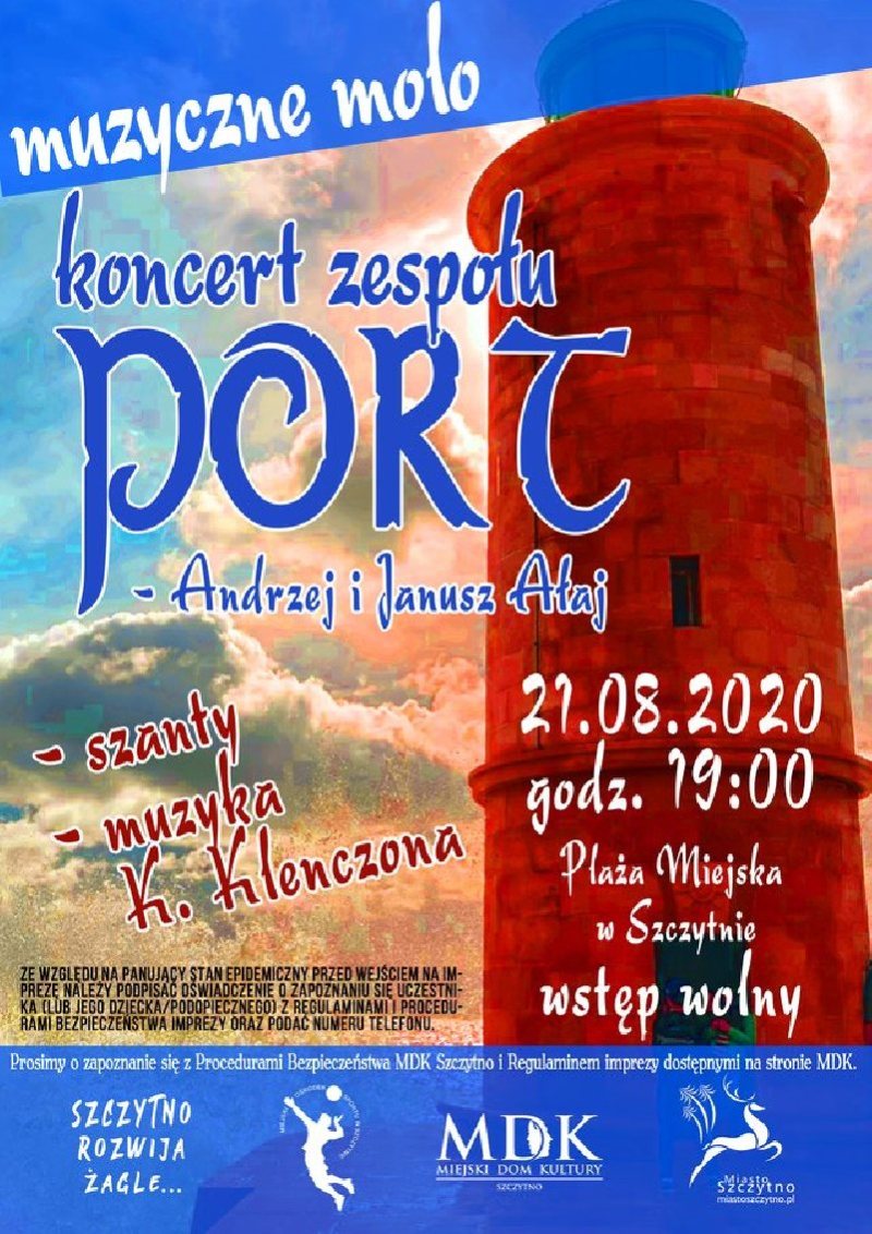 Polecamy koncert z cyklu "Muzyczne Molo". W piątek, 21 sierpnia zagra zespół PORT. Początek godz. 19. Wstęp wolny. Szczegóły na plakacie.