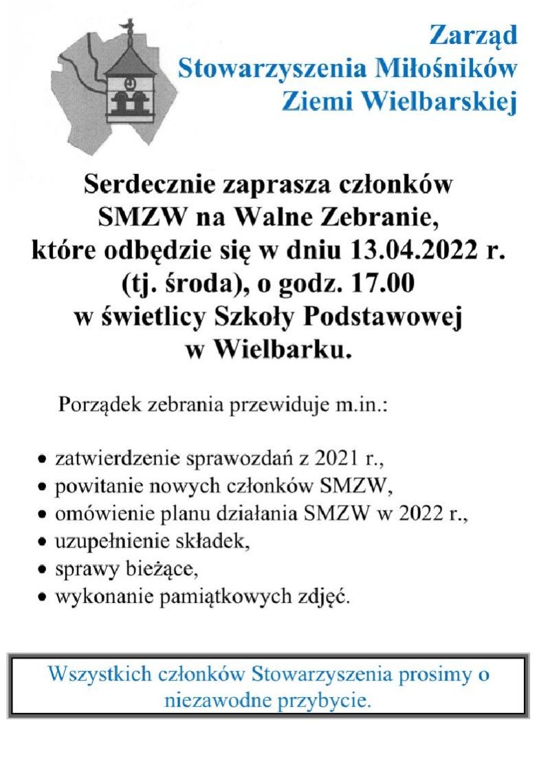 Na środę, 17 kwietnia zaplanowano Walne Zebranie członków Stowarzyszenia Miłośników Ziemi Wielbarskiej. Zebranie odbędzie się w świetlicy szkoły w Wielbarku. Początek godz. 17.