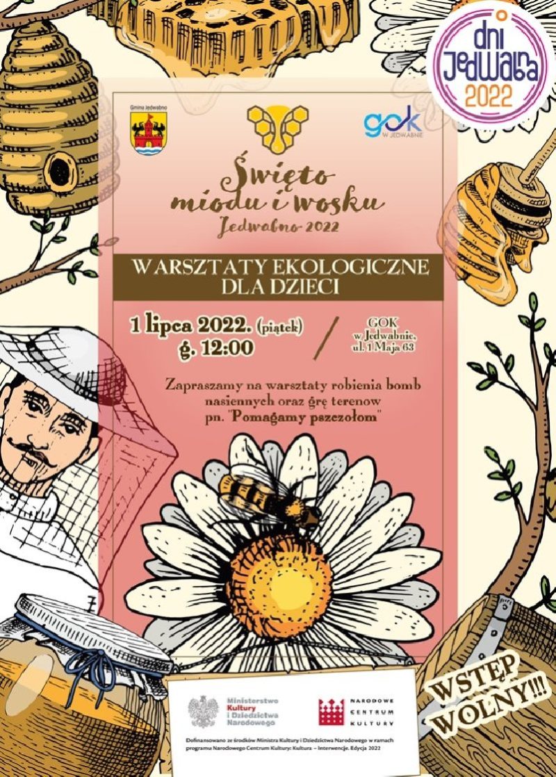 Gminny Ośrodek Kultury w Jedwabnie zaprasza na warsztaty ekologiczne dla dzieci, które odbędą się 1.07.2022 r., o godz. 12:00. Podczas warsztatów dowiecie się jak robi się bomby nasienne, a następnie zagramy w grę terenową. o pszczołach.