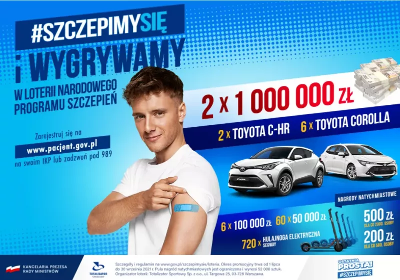 Ogólnopolska Loteria Narodowego Programu Szczepień jest jedną z form zachęty do szczepienia przeciw COVID-19. Mogą w niej uczestniczyć osoby, które ukończyły 18 lat, dokonały kompletnej procedury zaszczepienia przeciw COVID-19 i zarejestrowały się w loterii do 30 września br. Rejestrować można się przez Internetowe Konto Pacjenta na stronie pacjent.gov.pl lub dzwoniąc na Infolinię Narodowego Programu Szczepień pod numer 989.