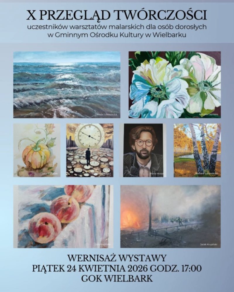 W piątek, 24 kwietnia o godz. 17:00 w Gminnym Ośrodku Kultury w Wielbarku odbędzie się wernisaż X Przeglądu Twórczości uczestników warsztatów malarskich dla dorosłych.
