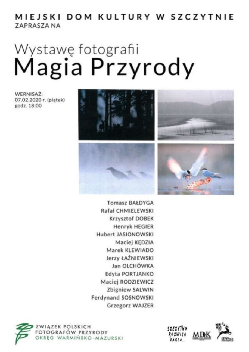 Miejski Dom Kultury w Szczytnie zaprasza na wernisaż wystawy fotografii Okręgu warmińsko-mazurskiego Związku Polskich Fotografów Przyrody, pt. "Magia Przyrody", który odbędzie się w piątek, 7 lutego 2020 r., o godz. 18:00, w Miejskim Domu Kultury w Szczytnie.