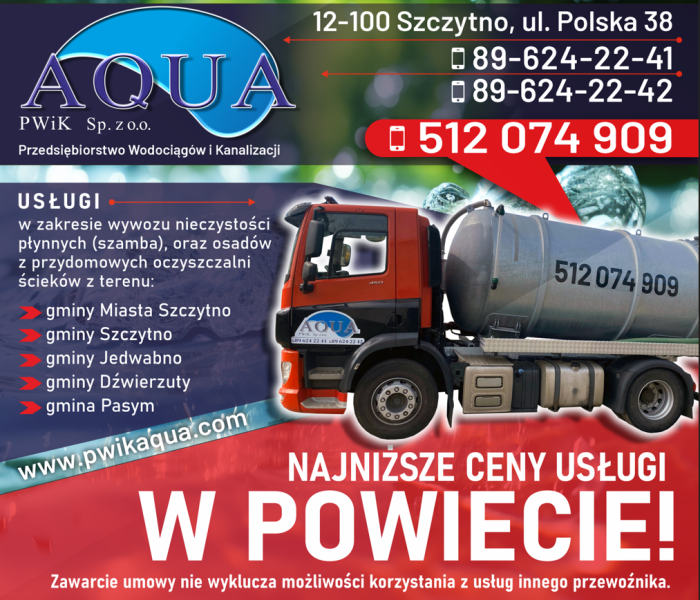 Firma obsługuje również gminy: Szczytno, Jedwabno, Dźwierzuty, Pasym. Co więcej, zawarcie umowy z „AQUĄ” nie wyklucza korzystania z usług innych przewoźników – to pełna wolność wyboru i konkurencyjne warunki.