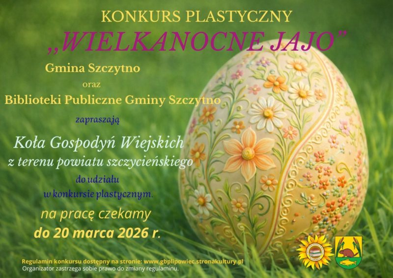 Gmina Szczytno oraz Biblioteki Publiczne Gminy Szczytno zapraszają Koła Gospodyń Wiejskich z terenu powiatu szczycieńskiego do udziału w powiatowym konkursie „Wielkanocne Jajo”.