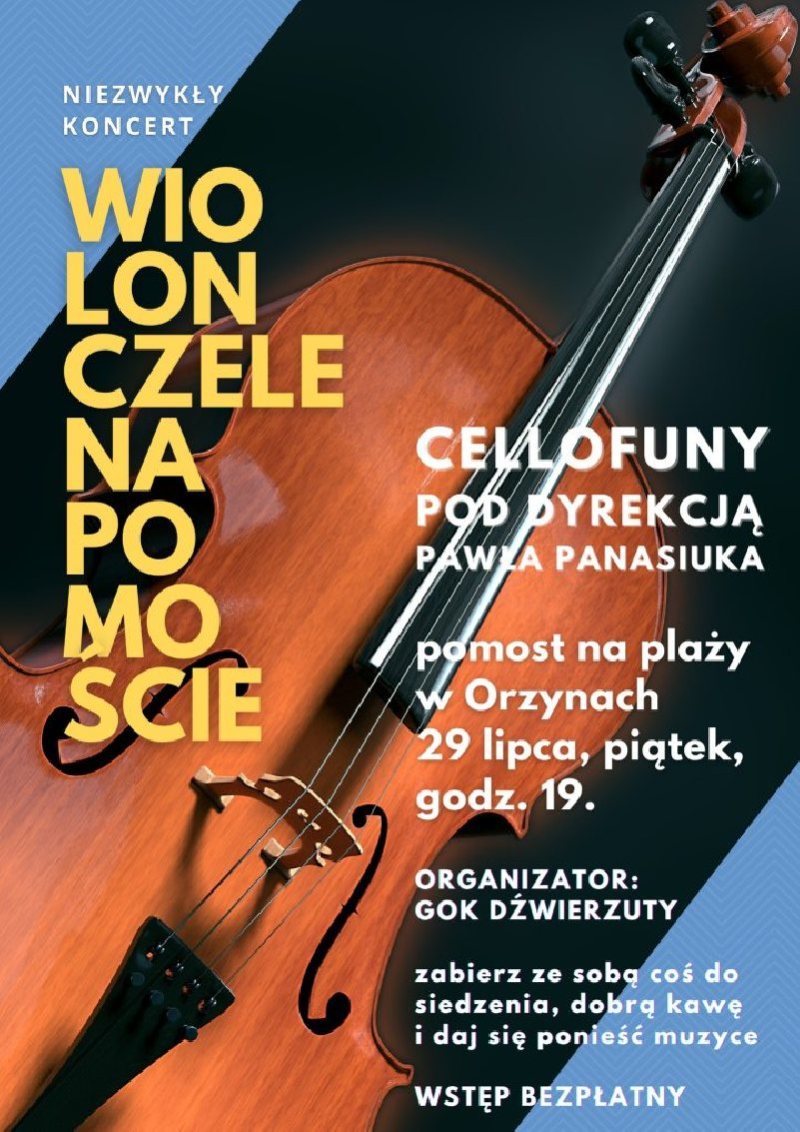 W piątek, 29 lipca odbędzie się niezwykły koncert „Wiolonczele na pomoście”. Wydarzenie zaplanowano na plaży w Orzynach (gmina Dźwierzuty). Początek godz. 19.