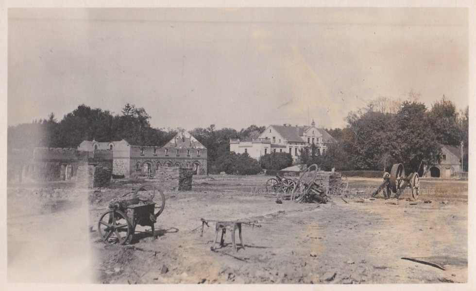 Zdjęcie z lat międzywojennych. Na pierwszym planie maszyny i budynki gospodarcze majątku. Wygląda to, jakby po jakimś pożarze. Być może są to nawet zniszczenia z okresu I wojny światowej, gdy wiele budynków w tej wsi spłonęło. W tle dwór z połowy XIX wieku.