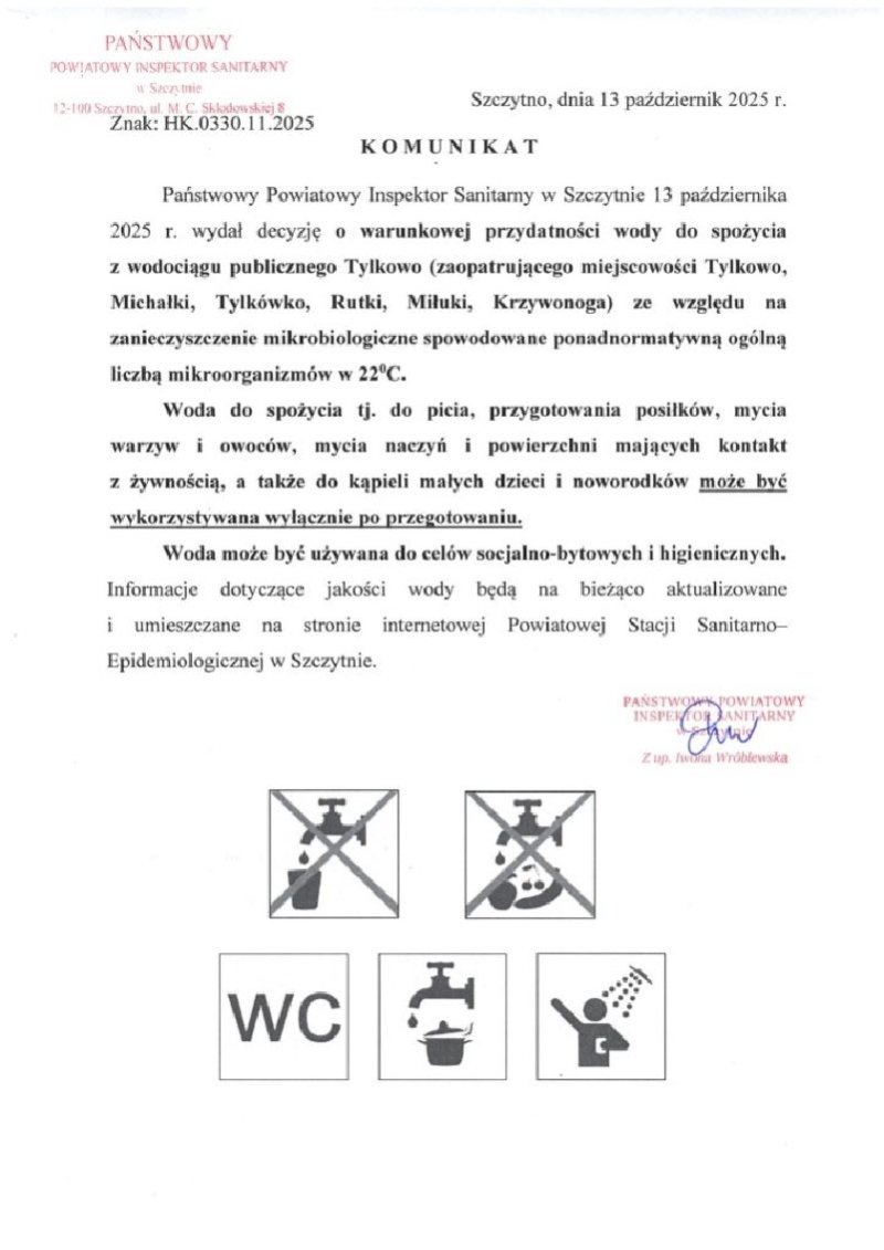 Decyzja dotyczy mieszkańców miejscowości Tylkowo, Michałki, Tylkówko, Rutki, Miłuki i Krzywonoga. Powodem jest zanieczyszczenie mikrobiologiczne – w próbkach wykryto ponadnormatywną liczbę mikroorganizmów w temperaturze 22°C.