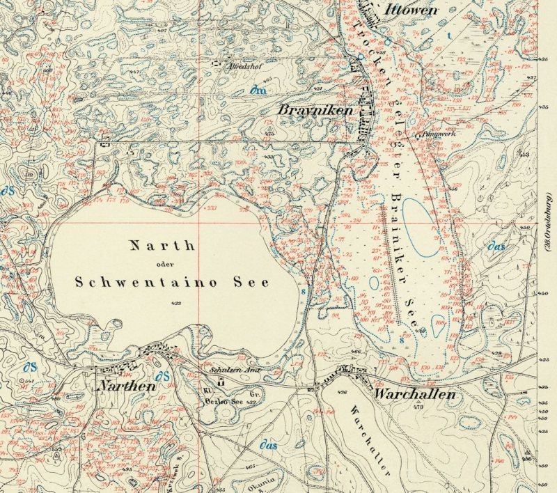 Na sytuację wodną w gminie, głównie w obrębie wsi Brajniki, Narty i Warchały, może mieć wpływ historia jezior w tych miejscowościach. Przy końcu XIX i na początku XX wieku poprzedni gospodarze tych ziem prowadzili szeroko zakrojone działania melioracyjne. Wiele ówczesnych bagien, terenów podmokłych zostało osuszonych. Te prace obejmowały także jeziora. - Akweny w Nartach i Brajnikach pierwotnie były bezodpływowe, ale położone w różnych zlewniach: Brajnickie w zlewni Pregoły, jezioro w Nartach – w zlewni Wisły – opowiada wójt Ambroziak. - Przy końcu XIX wieku płytkie Jezioro Brajnickie zostało osuszone, a wodę odprowadzono do niewielkiego jeziora w okolicy dzisiejszych Jurg. Pojeziorny teren zamieniono w łąki, ale woda rządziła się swoimi prawami i w dawnej jeziornej niecce pojawiały się wodne zastoiska, a teren wciąż był podmokły, dla łąk niekorzystny. Tę sytuację doskonale obrazuje np. bardzo dokładna mapy tego obszaru z 1902 roku. Ostatecznie więc, już w latach 30. XX wieku, proces został odwrócony – woda wróciła do jeziora w Brajnikach. Przy tych działaniach jeziora zostały połączone kanałami, które wspomagały „manipulowanie” wodą. Taki kanał łączył też jeziora w Nartach i Brajnikach. Świętajno (jezioro) stało się więc odpływowe. Dziś łączący akweny kanał jest suchy. - Woda z Nart nie odpływa, bo jest jej już tak mało – mówi Ambroziak.