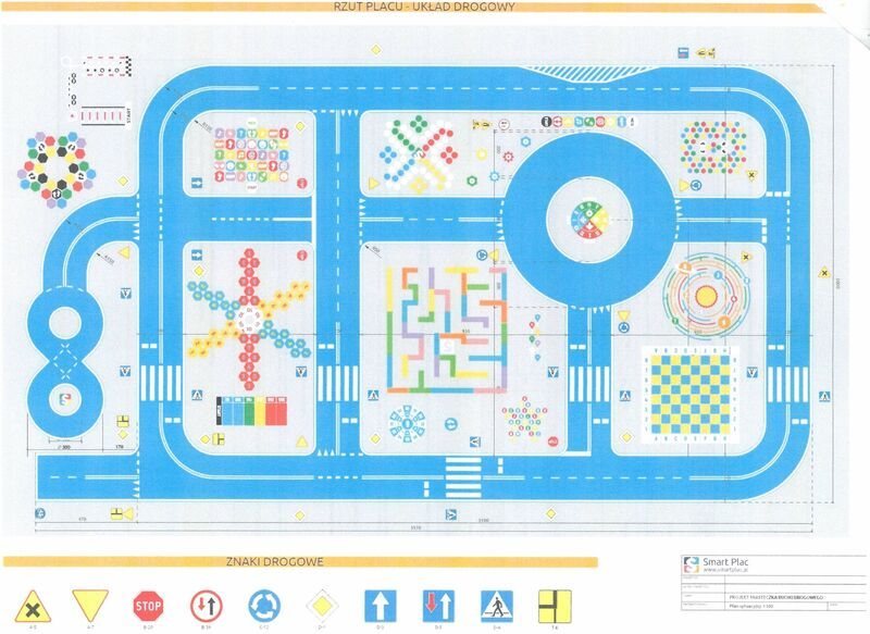 Miasteczko ruchu drogowego miałoby stanąć na tej części szkolnego boiska, którą obecnie pokrywa asfalt. Właściwie – nie tyle stanąć, co zostać wymalowane, oczywiście specjalnymi, trwałymi farbami. Przestrzenie pomiędzy „drogowymi skrzyżowaniami” wypełnione byłyby wielobarwnymi elementami do różnych gier ruchowych, które można dowolnie ustawiać, wykonanymi z trwałej masy termoplastycznej.