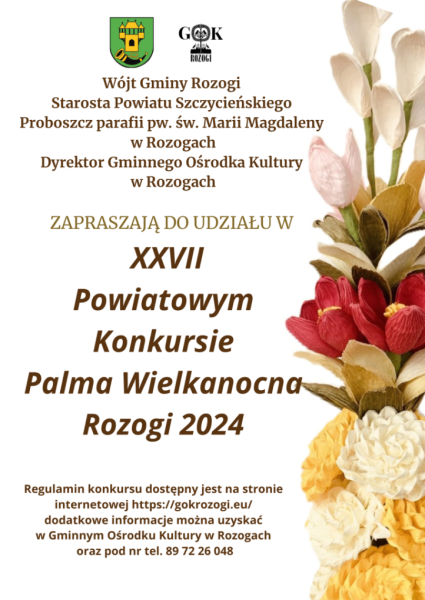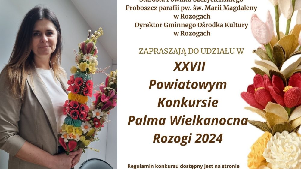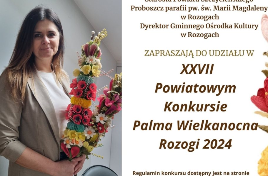 Poprzez Konkurs na Najpiękniejszą Palmę Wielkanocną, który w naszej gminie organizowany jest już od 27 lat. Podobnie jak w latach ubiegłych tak i w tym roku do udziału w Konkursie zapraszają organizatorzy: wójt Gminy Rozogi, starosta Powiatu Szczycieńskiego, proboszcz parafii pw. św. Marii Magdaleny w Rozogach i ja, czyli dyrektor Gminnego Ośrodka Kultury w Rozogach.