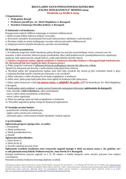 Sam konkurs będzie przebiegał w sposób podobny, jak w latach minionych. Szczegółowe warunki zawiera regulamin. W skrócie: uczestnicy do 18 marca zgłaszają chęć udziału, a do 22 marca dostarczają swoje dzieła do rozoskiego kościoła. Rozstrzygnięcie nastąpi 24 marca, czyli w Niedzielę Palmową.