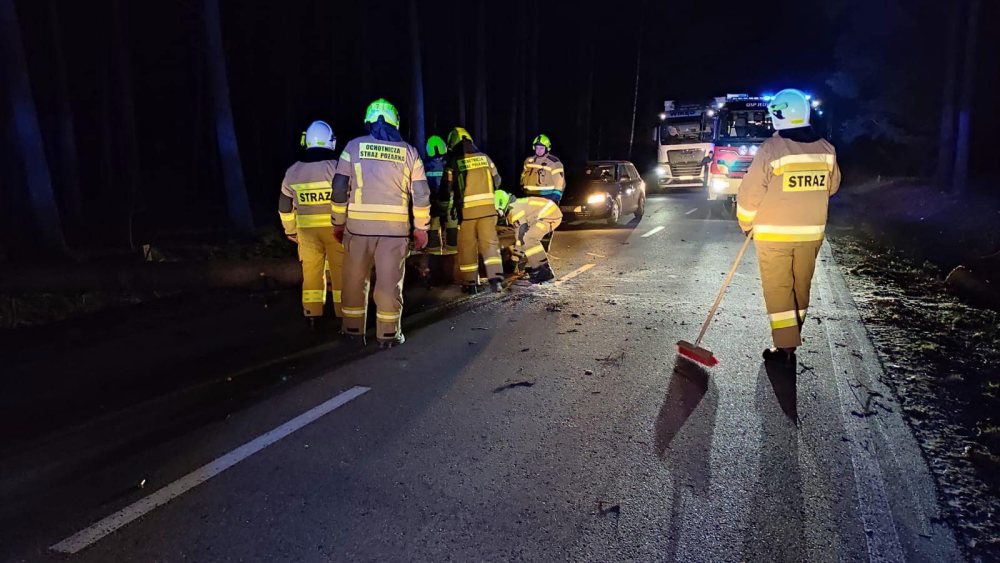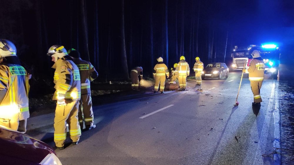 - Kierowca najprawdopodobniej zbyt późno zauważył na drodze przeszkodę i po prostu najechał na powalony konar drzewa– mówi kapitan Paweł Kozłowski z KP PSP w Szczytnie. - Nasze działania polegały na zabezpieczeniu terenu, oświetleniu. Usunęliśmy drzewo z drogi, zneutralizowaliśmy też płyny eksploatacyjne, które wylały się z auta na drogę.