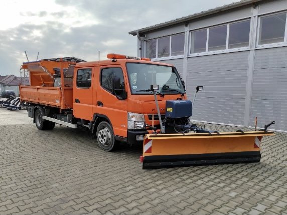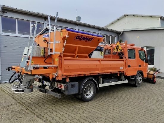 samochód FUSO Canter ma ładowność DMC 4 tony, sama piaskarka ma 1.2 tony, a ładowność ma 2,2 ton, pług 0,4 tony, co daje razem 3,8 tony, a samochód w zestawie razem z przyczepą ma DMC 10,5 tony,