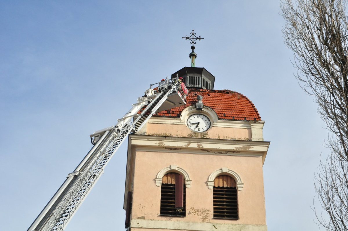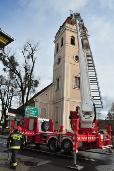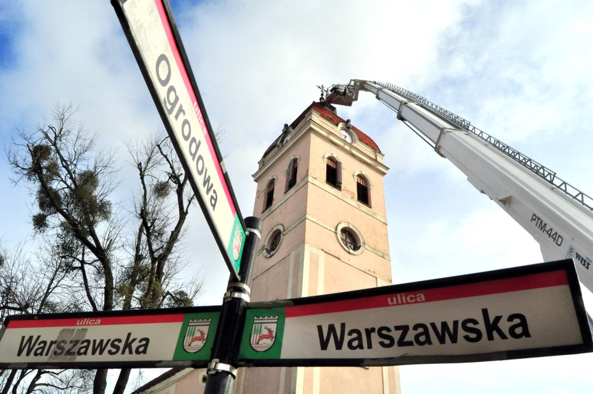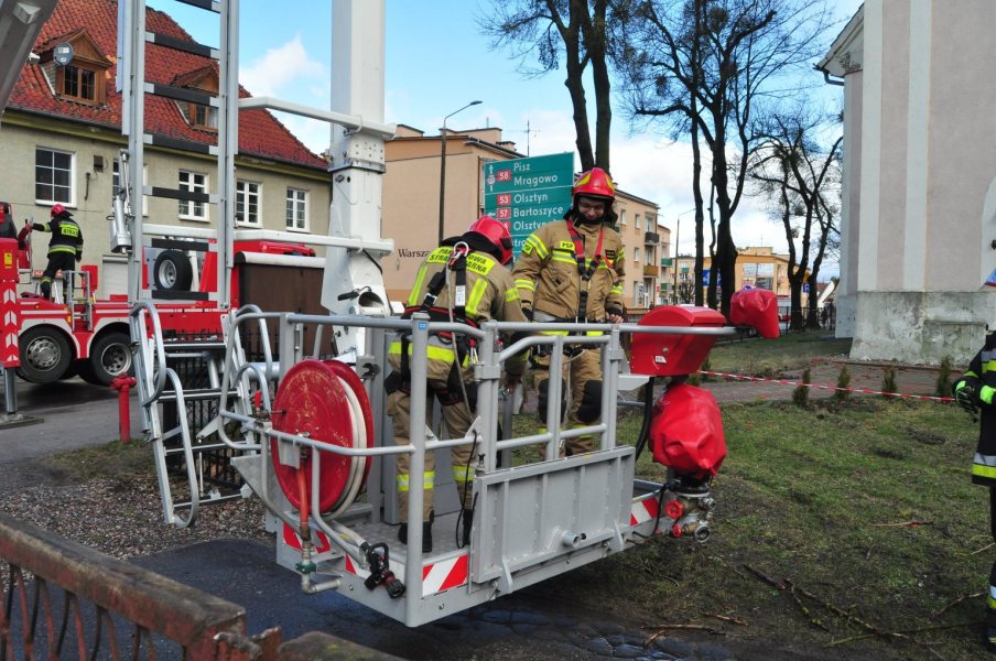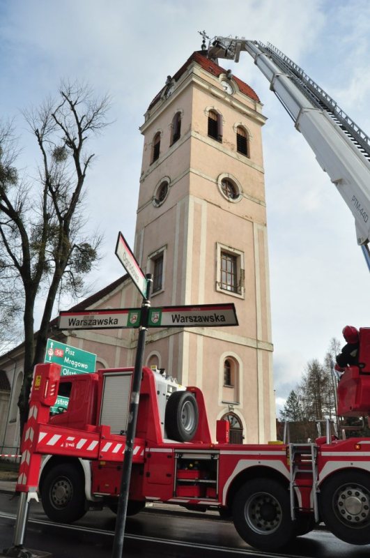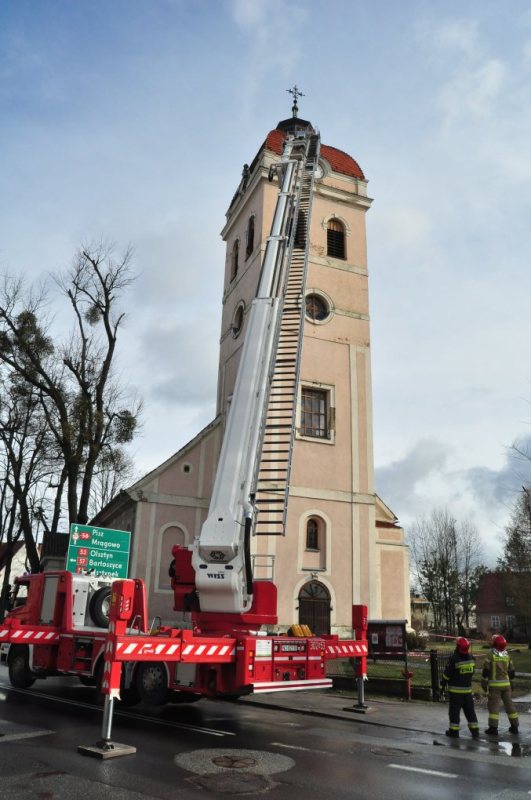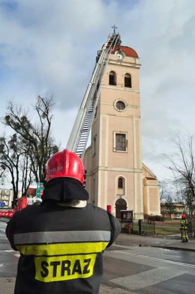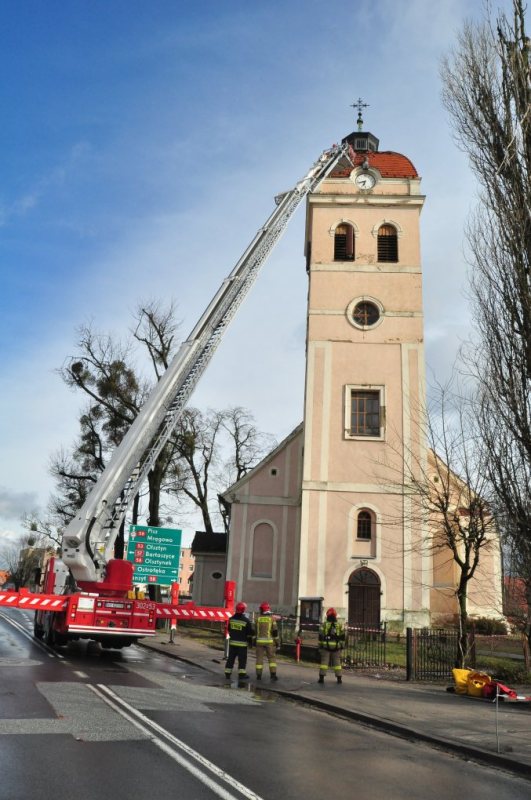Pozrywane dachy, poprzewracane kominy i drzewa, uszkodzona wieża kościoła ewangelickiego w Szczytnie, 165 strażackich interwencji w naszym powiecie, kilka tysięcy gospodarstw i domów bez prądu – to bilans szalejącej przez ostatnie dwa dni wichury. Wciąż trwa usuwanie szkód. Strażacy właśnie sprawdzają w jakim stanie jest wieża kościoła przy ulicy Warszawskiej w Szczytnie. Ściągnięto w tym celu nawet specjalistyczny podnośnik z Olsztyna.