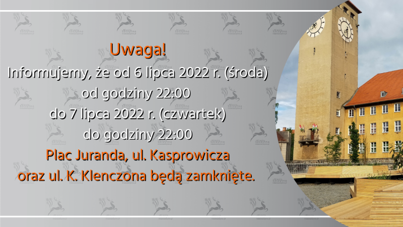 Urząd Miejski w Szczytnie poinformowała, że od 6 lipca 2022 r. (środa) od godziny 22:00 do 7 lipca 2022 r. (czwartek) do godziny 22:00 Plac Juranda, ul. Kasprowicza oraz ul. K. Klenczona będą zamknięte.