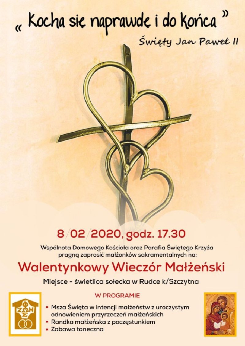 Walentynkowy wieczór rozpocznie msza święta w intencji małżeństw, którą odprawi ksiądz dziekan Andrzej Wysocki. Potem nastąpi odnowienie przyrzeczenia małżeńskiego. Zaplanowana jest też randka małżeńska z poczęstunkiem oraz wieczór taneczny.