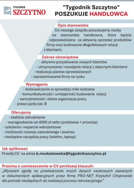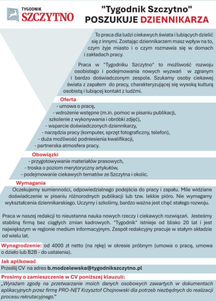 "Tygodnik Szczytno" funkcjonuje na lokalnym rynku od blisko 20 lat. Oferujemy stabilną pracę i możliwość rozwoju. Jesteś zainteresowany (zainteresowana)? Aplikuj!