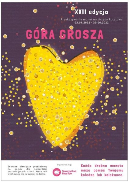 Ponadto serdecznie zapraszamy do udziału w akcji „GÓRA GROSZA”, organizowanej przez Towarzystwo Nasz Dom. Celem akcji jest zebranie funduszy na pomoc dzieciom wychowującym się poza własną rodziną. W ramach akcji przeprowadzana jest zbiórka monet o nominałach od 1 grosza do 5 złotych. Akcja Góra Grosza trwa od 2.11-21.12. Przez całą akcję monety będą zbierać Wolontariusze podczas lekcji oraz jest możliwość dorzucenia się do zbiórki w "okienku" w wejściu do szkoły.