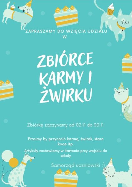 - Drodzy uczniowie, rodzice oraz Przyjaciele Szkoły! Dużymi krokami zbliża się zima – można przeczytać na stronie internetowej szkoły. - W chłodne dni nie możemy zapomnieć o naszych kochanych zwierzakach w Szczycieńskim schronisku. W związku z tym organizujemy na terenie naszej szkoły zbiórkę koców, prześcieradeł, legowisk, żwirku, a przede wszystkim karmy dla psów oraz kotów. Zbiórka trwa od 2 do 30 listopada. Przyniesione dary umieszczamy w kartonie przy wejściu do szkoły. Z góry dziękujemy w imieniu opiekunów zwierząt, ale i samych Milusińskich.