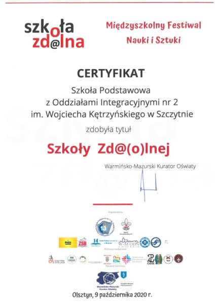 Uczniowie Szkoły Podstawowej z Oddziałami Integracyjnymi nr 2 w Szczytnie wzięli udział w Międzyszkolnym Festiwalu Nauki i Sztuki, który odbywał się pod patronatem Warmińsko Mazurskiego Kuratora Oświaty. Głównym celem Festiwalu było pokazanie w jaki sposób można integrować różne umiejętności podczas pracy zdalnej, by wspólnie, niezależnie od warunków, tworzyć wspaniałe projekty.