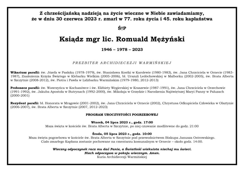 W piątek, 30 czerwca o godz 15. 30 w szpitalu w Olsztynie zmarł ksiądz Romuald Mężyński z parafii Św. Brata Alberta w Szczytnie...
