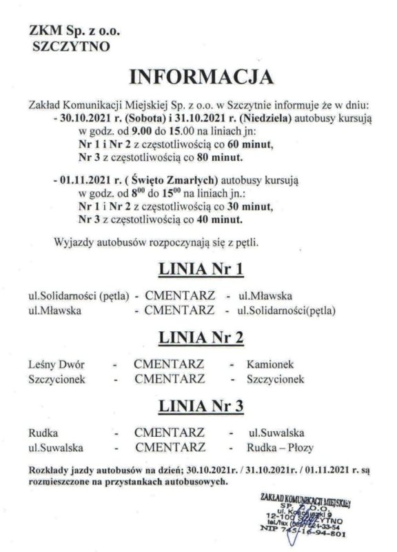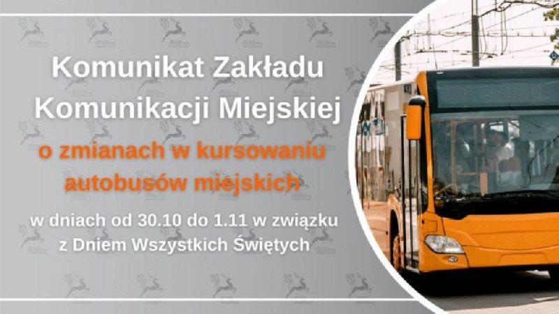 Zapraszamy do zapoznania się z komunikatem Zakładu Komunikacji Miejskiej o zmianach w kursowaniu autobusów w dniach od 30.10 do 1.11 z uwagi na Dzień Wszystkich Świętych.