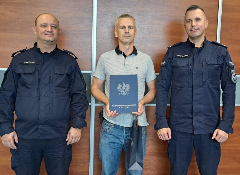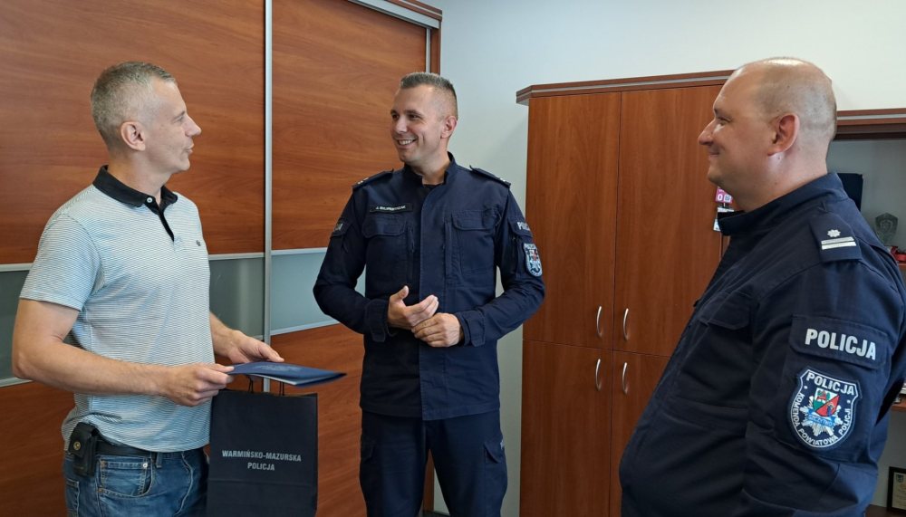 Komendanci Powiatowi Policji w Szczytnie, p.o. Komendanta podinsp. Jakub Sylwestrzak oraz I Zastępca Komendanta podinsp. Paweł Przybyłek, zaprosili pana Karola do komendy, aby osobiście podziękować mu za jego obywatelską postawę. Podczas spotkania podinsp. Jakub Sylwestrzak podkreślił, że takie zachowanie jest godne najwyższego uznania i stanowi wzór do naśladowania dla całego społeczeństwa, w tym również dla dzieci, które były świadkami tego zdarzenia.