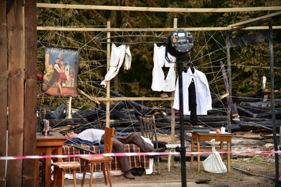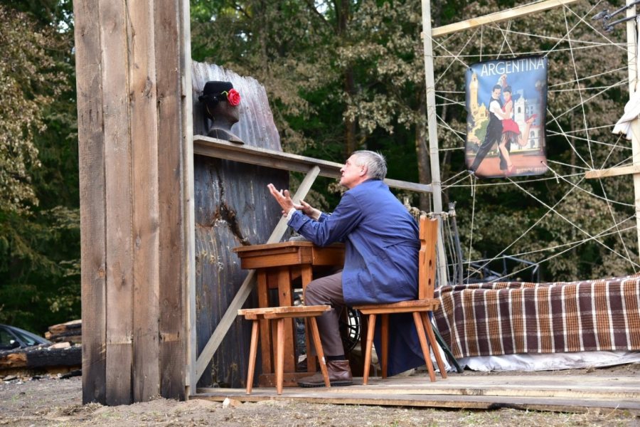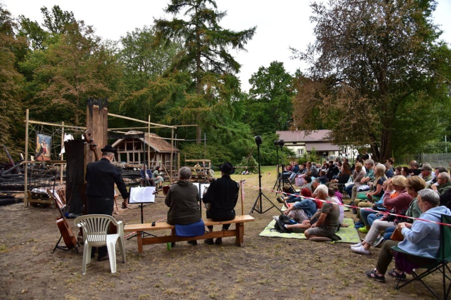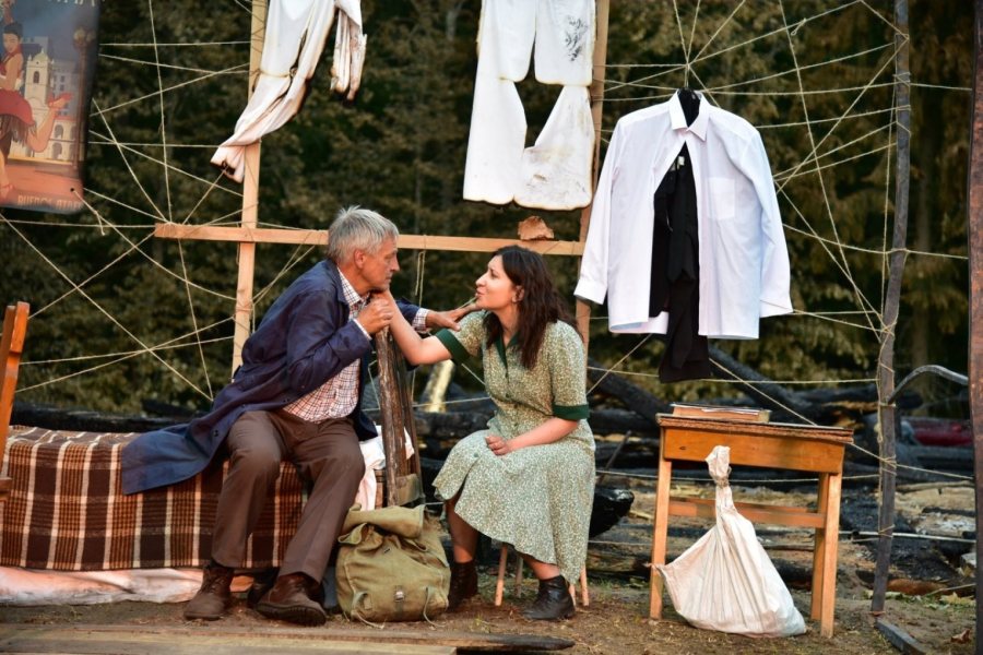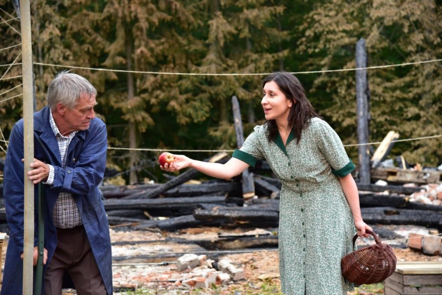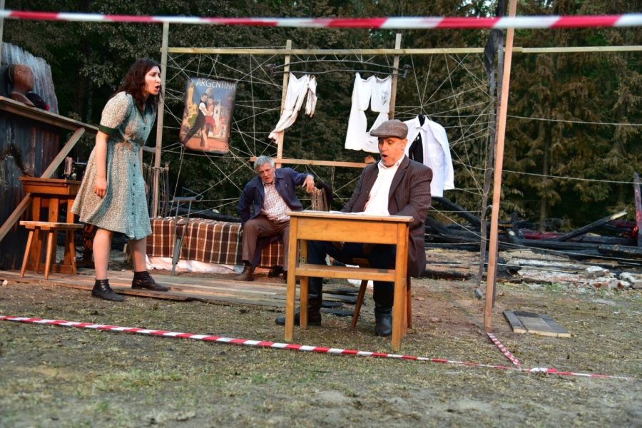 Tego wieczoru publiczność obejrzała „Kartafkę Maeterlincka” – spektakl, którego akcja toczy się w ruinach powojennego Szczytna. W nowych okolicznościach – pod otwartym niebem, w miejscu spalonej stodoły – historia nabrała dramatycznej głębi.